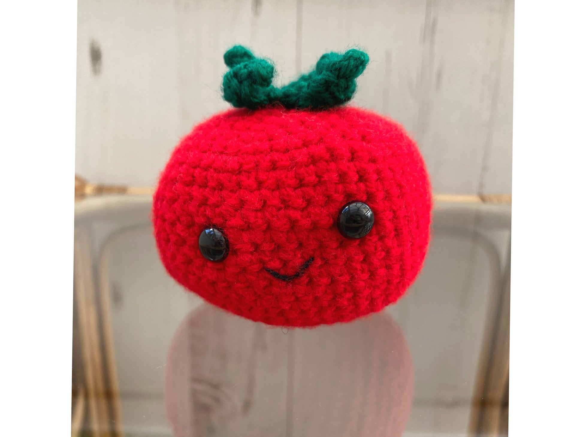 This smiley tomato is made of red acrylic yarn, stuffed with extra soft toy stuffing. Sewn on is a dark green leaf, black embroidered smile and finished off with two safety eyes.